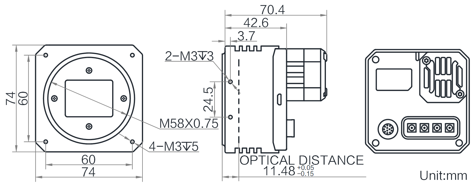 | 结构 | 镜头接口 | M58*0.75,法兰后焦 11.48 mm 或 F 口,法兰后焦 46.5 mm |