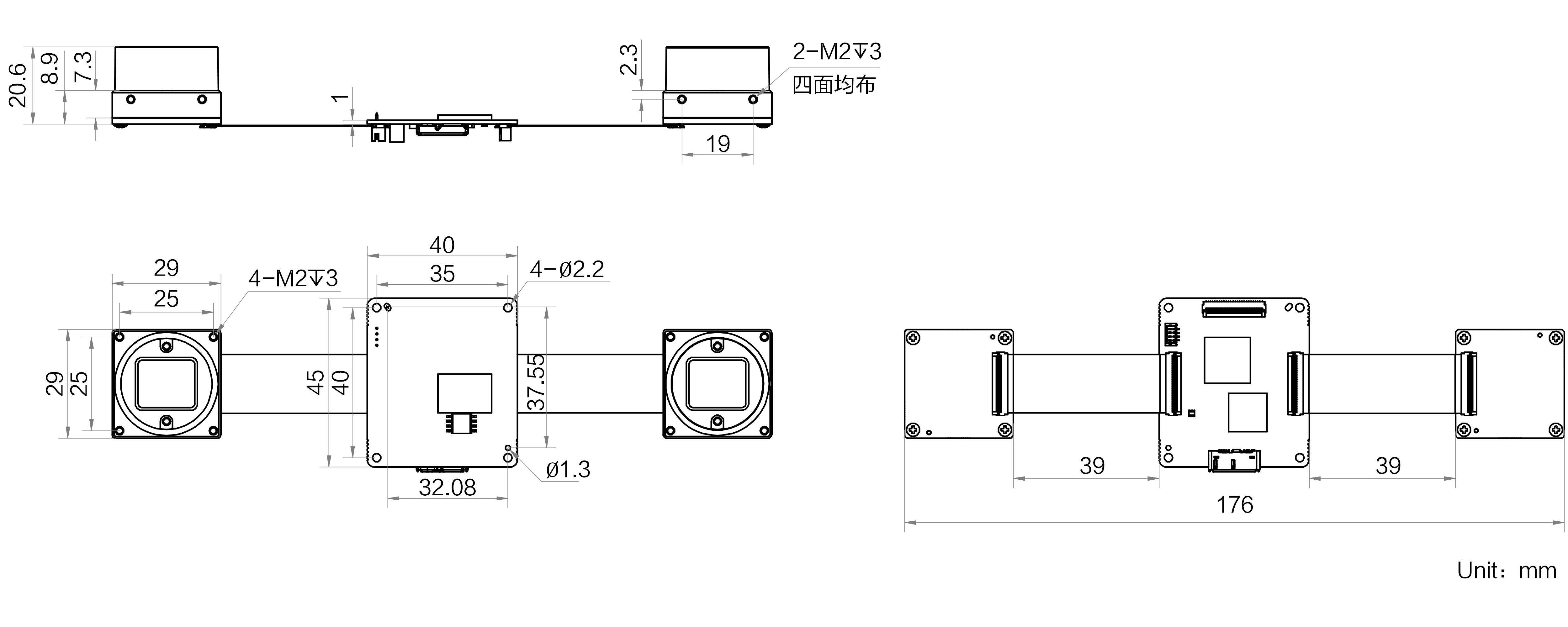 | 外形尺寸 | Sensor板(不带前盖):29 mm × 29 mm × 1.6 mm 主板:45 mm × 40 mm × 1 mm FPC长度:39 mm |