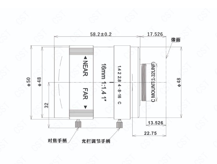CST 康视达 CST-C1614-5M 工业镜头 型号 CST-C1614-5M 焦距 16 光圈系数 1.4 最大像面尺寸 1" 视野范围 FOV@WD 200(H×V) 1" 167.11×125.26 2/3" 110.53×93.42 1/2" 84.21×63.16 畸变 <0.2% 最近距离 0.1M 滤镜螺纹 M46×P0.75 接口 C Mount 手机/微信:18320955412 电话:86 0755 84689265 QQ:2423332841 邮箱:2423332841@qq.com...