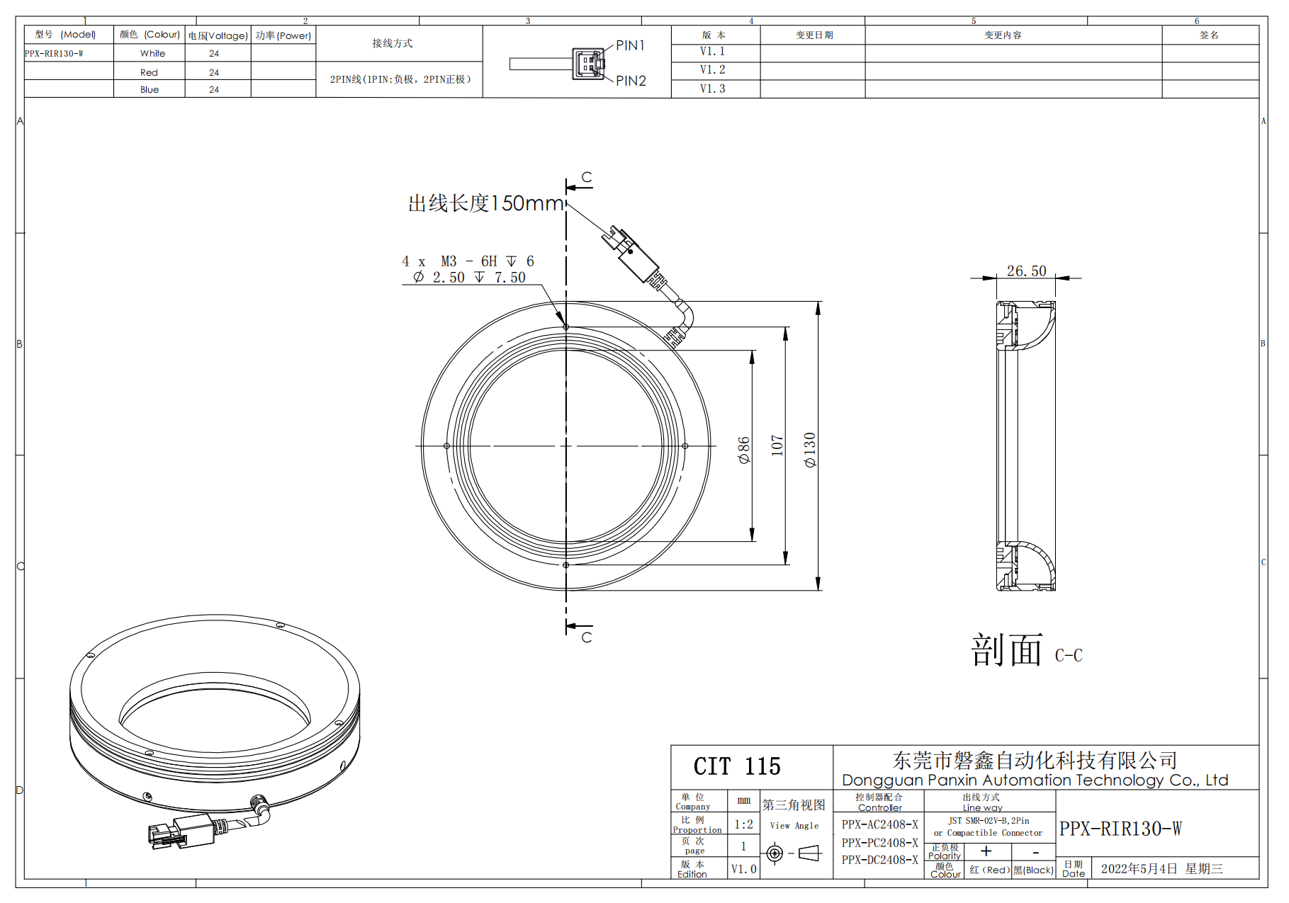 PPX 磐鑫 PPX-RIR130-W 环形多方向无影光源 01. 技术指标 02. 选型说明 03. 特殊定制项目 04. 光谱分布 手机/微信:18320955412 电话:86 0755 84689265 QQ:2423332841 邮箱:2423332841@qq.com