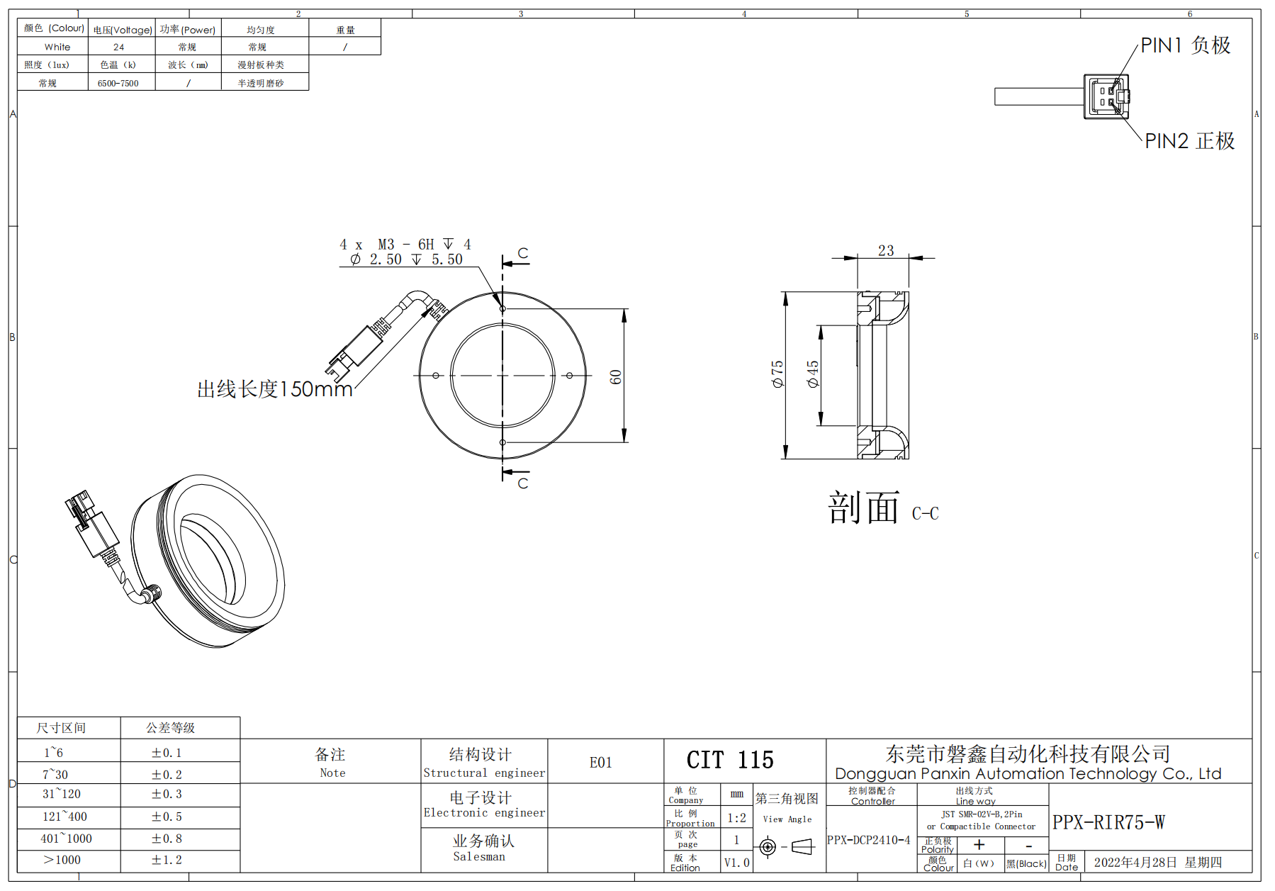 PPX 磐鑫 PPX-RIR75-W 环形多方向无影光源 01. 技术指标 02. 选型说明 03. 特殊定制项目 04. 光谱分布 手机/微信:18320955412 电话:86 0755 84689265 QQ:2423332841 邮箱:2423332841@qq.com