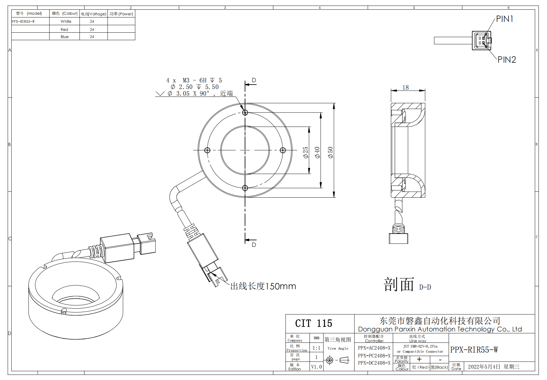 PPX 磐鑫 PPX-RIR55-W 环形多方向无影光源 01. 技术指标 02. 选型说明 03. 特殊定制项目 04. 光谱分布 手机/微信:18320955412 电话:86 0755 84689265 QQ:2423332841 邮箱:2423332841@qq.com