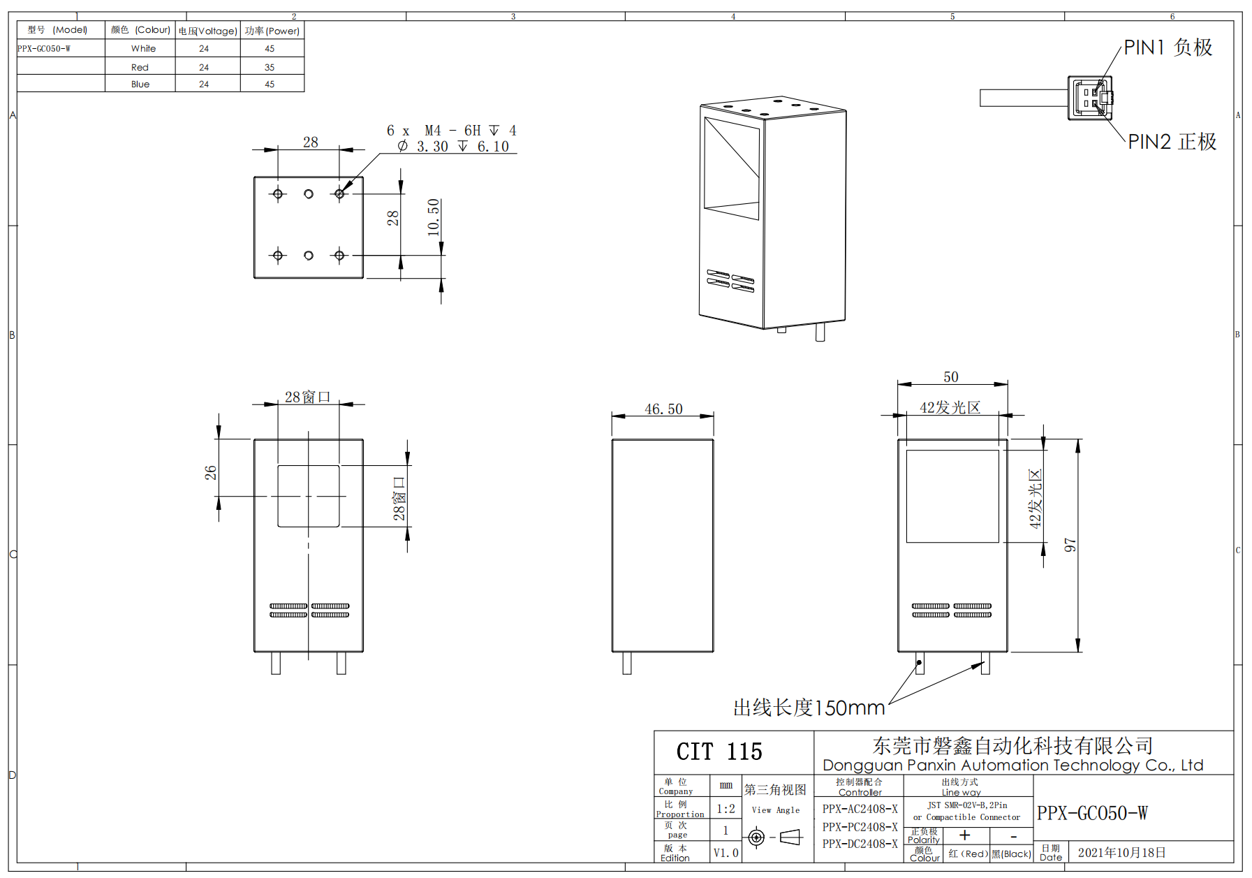 PPX 磐鑫 PPX-GCO50-W 高亮同轴光源 01. 技术指标 02. 选型说明 03. 特殊定制项目 04. 光谱分布 手机/微信:18320955412 电话:86 0755 84689265 QQ:2423332841 邮箱:2423332841@qq.com