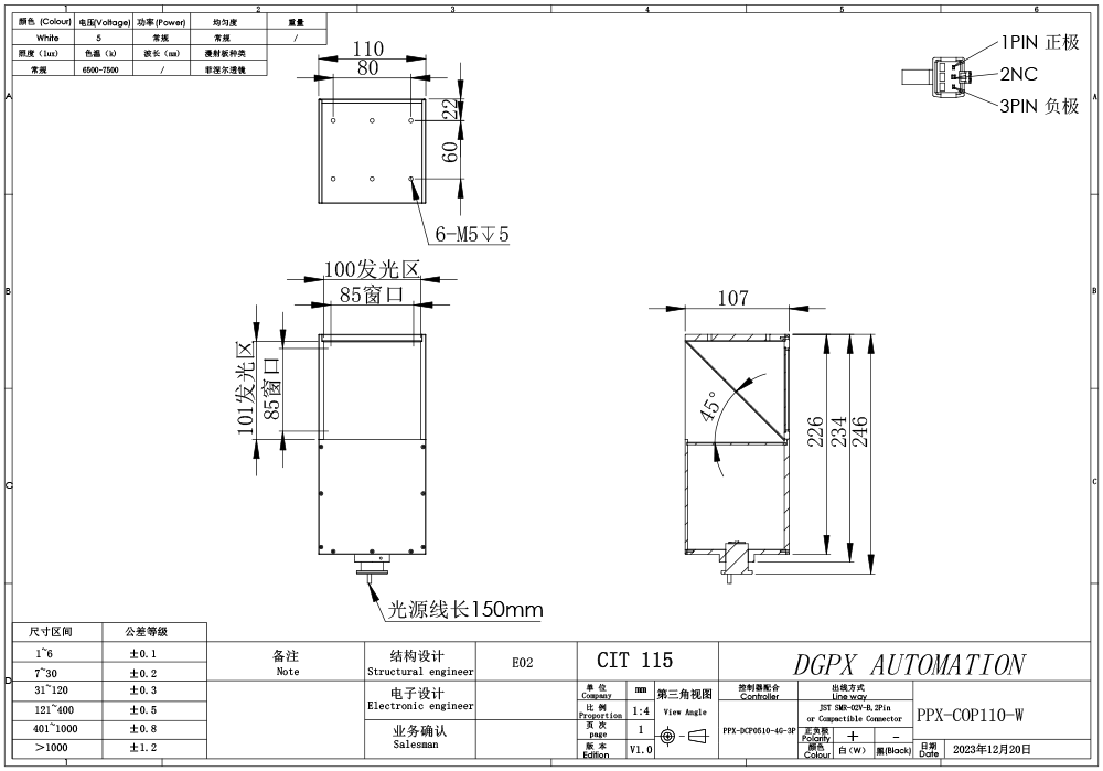 PPX 磐鑫 PPX-COP110 同轴平行光源 01. 技术指标 02. 选型说明 03. 特殊定制项目 04. 光谱分布 手机/微信:18320955412 电话:86 0755 84689265 QQ:2423332841 邮箱:2423332841@qq.com