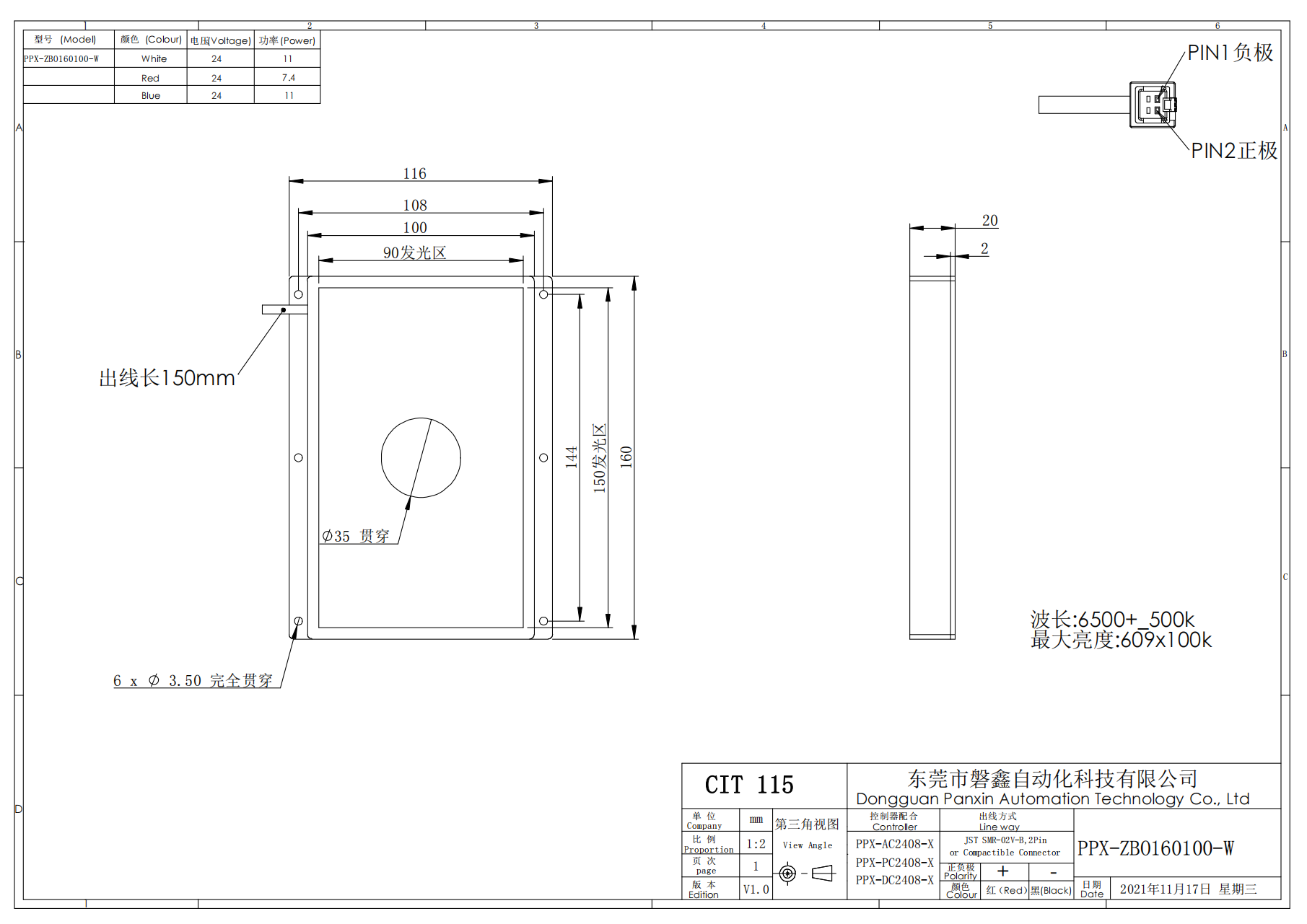 PPX 磐鑫 PPX-ZBO160100-W 中孔背光源 01. 技术指标 02. 选型说明 03. 特殊定制项目 04. 光谱分布 以下皆为实验室数据仅供参考* 手机/微信:18320955412 电话:86 0755 84689265 QQ:2423332841 邮箱:2423332841@qq.com