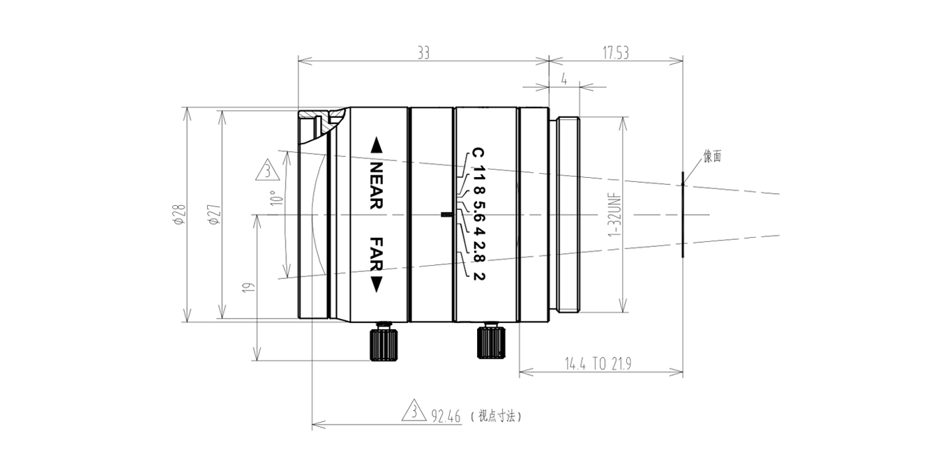 | 1/3"视场角Angle | 7.9°×5.9° | 尺寸 | φ28×33 |