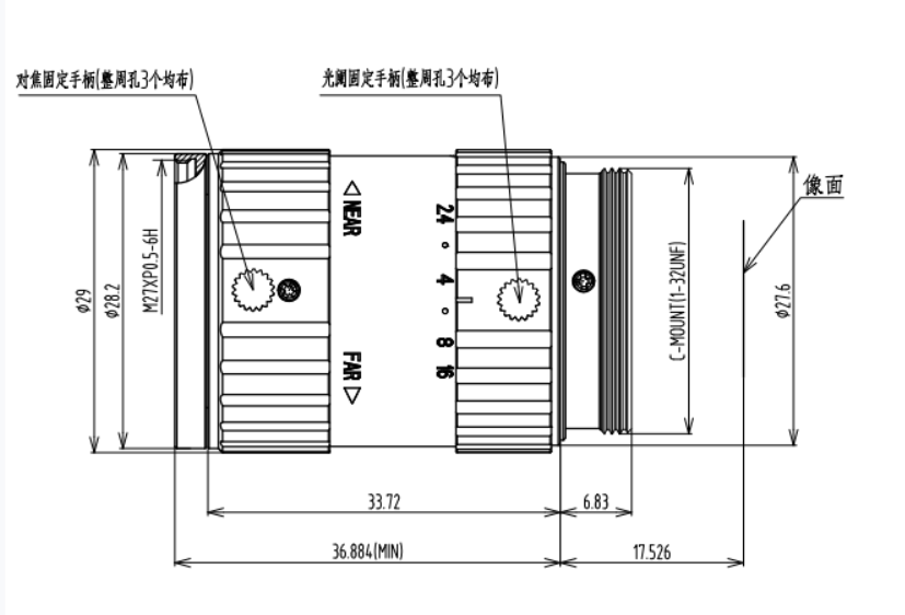 | 1/2"视场角Angle | 22.1°×16.66° | 最近工作距离 MOD | 0.1m、0.147x |