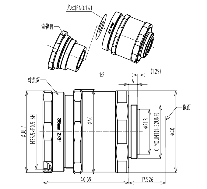 | 滤镜螺纹 | M35.5×P0.5 | 1/2"视场角Angle | 10.1°×7.6° |