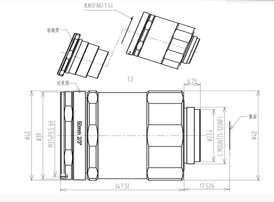 | 1/3"视场角Angle | 5.7°×4.3° | 尺寸 | φ40×47.5 |