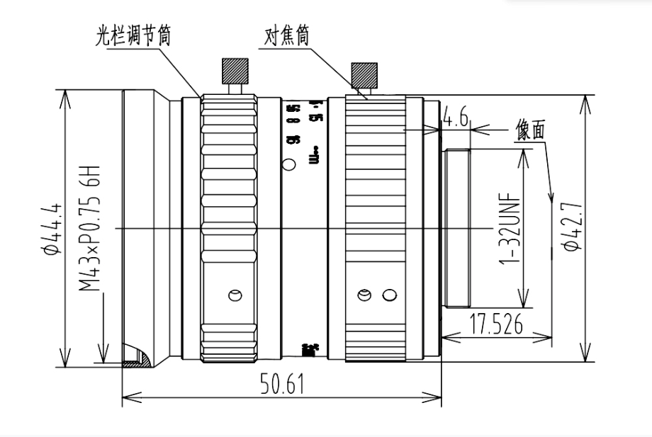 | 滤镜螺纹 | M43×P0.75 | 2/3"视场角Angle | 13.5°×10.2° |