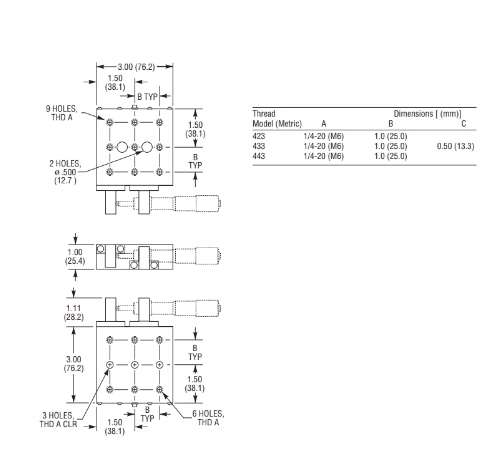 XY线性平移台,13毫米行程,1/4-20螺纹,有孔径