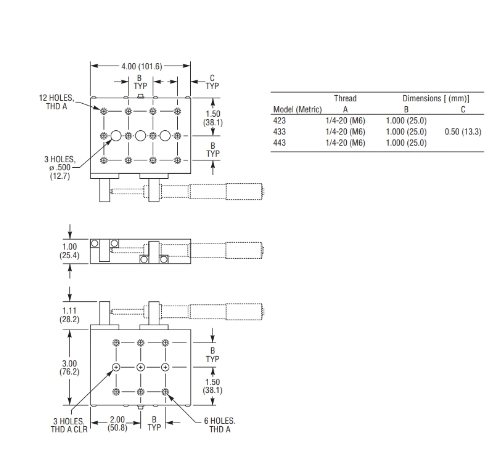 433线性位移台是3英寸x 4英寸的大型平台,具有卓越的性能,可用性和价值,采用精密的滚珠轴承结构–硬化的滚珠在相对的成对硬化和抛光不锈钢棒之间滚动,从而提供了优于200微弧度的角度偏差。为了获得稳定性,可重复性和异常平稳的运动,促动器支撑在硬化的硬质合金刀片上。弹簧提供对促动器尖端的预紧力,以消除间隙。尽管平台使用SM-50千分尺驱动器可以移动完整的1.8英寸(46毫米),但促动器安装块可以重新配置,以容纳1.0英寸(25.4毫米)的驱动器,如SM-25。该平台也可以重新配置为左手版本,千分尺位于相对侧。无影响的锁(对于左手配置也是可逆的)提供了可靠的稳定定位并防止意外调整。此平台的促动器单独出售。