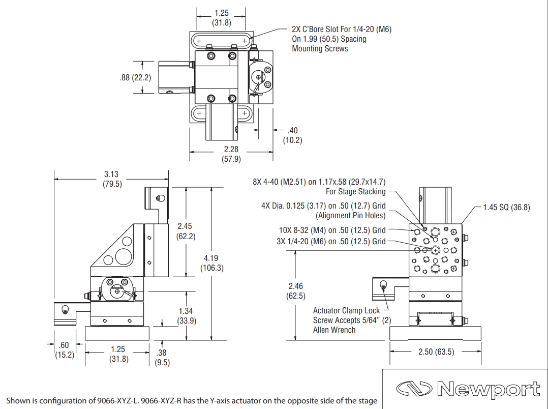 9066-XYZ-R右手式不锈钢交叉滚子XYZ平移台是一个0.5英寸行程的线性平移台,可让您用右手调整后促动器,用左手调整侧促动器。9066系列平台具有大量的安装孔图案,包括8个4-40,10个8-32和3个1/4-20的螺纹安装孔,不包括促动器。请参阅推荐促动器的说明。