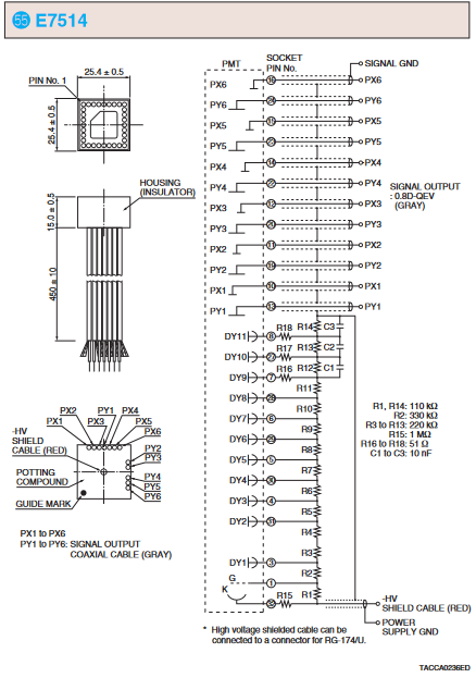 HAMAMATSU滨松 D型插座组件 E7514 详细参数 适用的 PMT 金属封装 PMT R8900U-C12 接地电极 阳极 电源电压极性 - [Max. Rating] 绝缘电压(机箱 - 引脚) 1000 V [Max. Rating] 电源电压 1000 V [Max. Rating] 分压器电流 0.34 mA 信号漏电流最大值 1.0 x 10-10 A 总分压器电阻 2.97 MΩ 最大值 DC 模式下的线性输出 1.4(1000 V 时)μA 信号输出 直流 / 脉冲 备注 电缆输出 0755 84689265 手机/微信:18320955412 QQ:2423332841 邮箱:2423332841@qq.com...