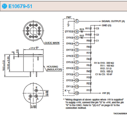 HAMAMATSU滨松 D型插座组件 E10679-51 详细参数 适用的 PMT 金属封装 PMT R9880U 接地电极 阳极 电源电压极性 - [Max. Rating] 绝缘电压(机箱 - 引脚) 1100 V [Max. Rating] 电源电压 1100 V [Max. Rating] 分压器电流 0.32 mA 信号漏电流最大值 1.0 x 10-10 A 总分压器电阻 3.46 MΩ 最大值 DC 模式下的线性输出 16(1100 V 时)μA 信号输出 直流 / 脉冲 备注 引脚输出(用于板载) 0755 84689265 手机/微信:18320955412 QQ:2423332841 邮箱:2423332841@qq.com...