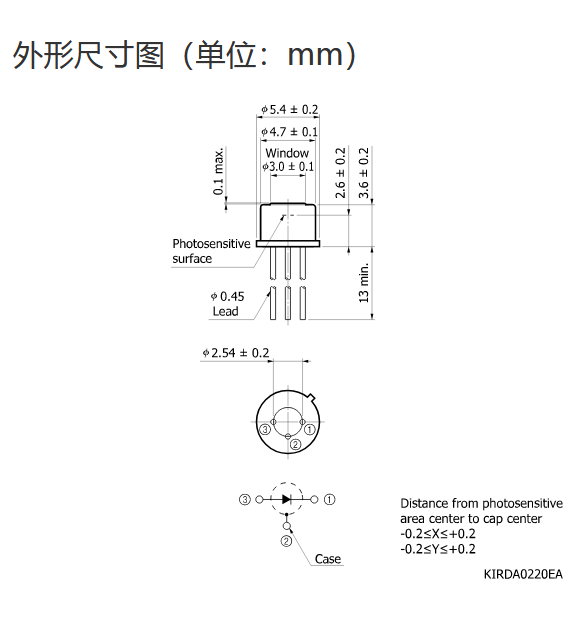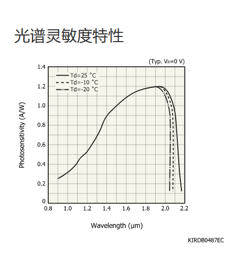 典型值 Tc = 25°C,除非另有说明,感光灵敏度:λ = λp,暗电流:VR = 0.5 V,截止频率:VR = 0 V,RL = 50 Ω,结电容:VR = 0 V,f = 1 MHz |