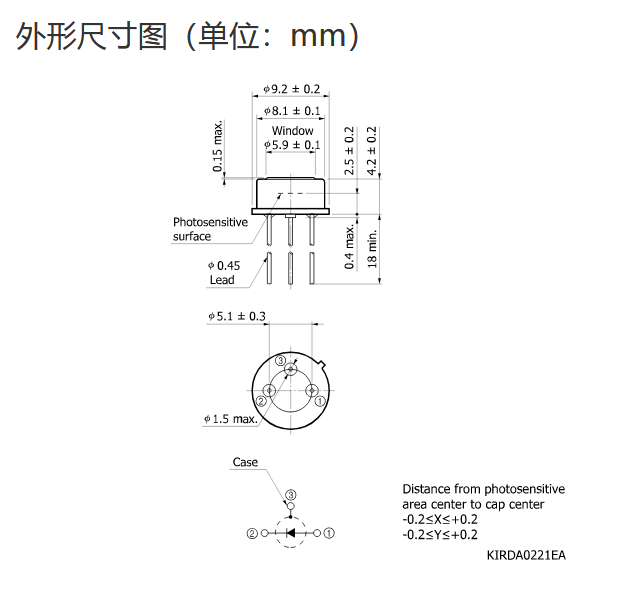典型值 Tc = 25°C,除非另有说明,感光灵敏度:λ = λp,暗电流:VR = 0.5 V,截止频率:VR = 0 V,RL = 50 Ω,结电容:VR = 0 V,f = 1 MHz |