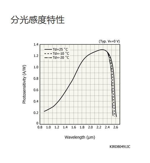 典型值 Tc = -25°C,除非另有说明,感光灵敏度:λ = λp,暗电流:VR = 0.5 V,截止频率:VR = 0 V,RL = 50 Ω,结电容:VR = 0 V,f = 1 MHz |