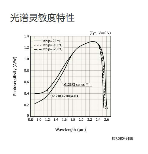 典型值 Tc = -25°C,除非另有说明,感光灵敏度:λ = λp,暗电流:VR = 0.5 V,截止频率:VR = 0 V,RL = 50 Ω,结电容:VR = 0 V,f = 1 MHz |