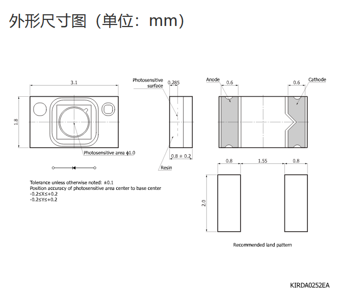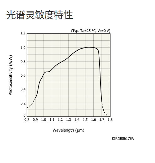 典型值 Ta = 25°C,除非另有说明,感光灵敏度:λ = λp,暗电流:VR = 5 V,截止频率:VR = 5 V,RL = 50 Ω,结电容:VR = 5 V,f = 1 MHz |
