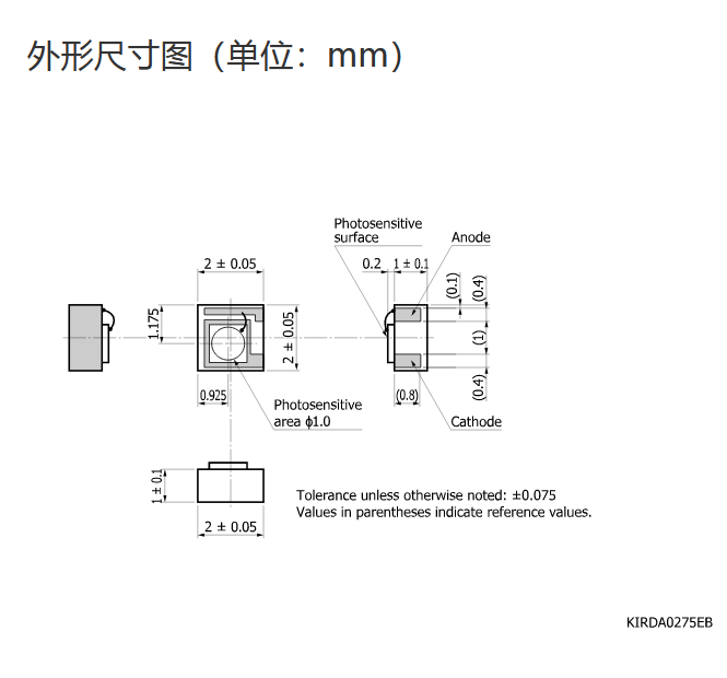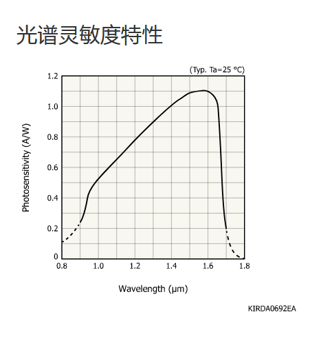 典型值 Ta = 25°C,除非另有说明,感光灵敏度:λ = λp,暗电流:VR = 5 V,截止频率:VR = 5 V,RL = 50 Ω,结电容:VR = 5 V,f = 1 MHz |