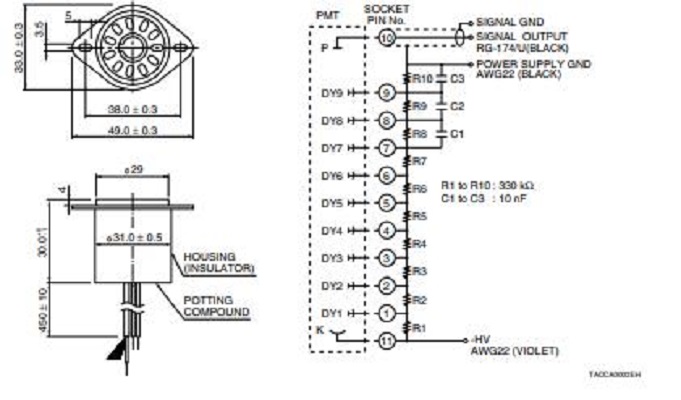 HAMAMATSU滨松 侧面式光电倍增管 R5983P 详细参数 类型 侧面式 管子尺寸 28 mm 直径 光阴极面区域形状 正方形 光阴极面区域尺寸 10 x 24 mm 波长(短) 185 nm 波长(长) 710 nm 波长(峰值) 410 nm 光谱灵敏度特性曲线代码 456U 光阴极面材料 低噪声双碱 窗材 紫外玻璃 倍增器电极结构 圆形罩壳 倍增器电极级数 9 [Max. Rating] 阳极至阴极电压 1250 V [Max. Rating] 平均阳极电流 0.1 mA 阳极至阴极电源电压 1000 V [Cathode] 亮度灵敏度最小值 60 μA/lm [Cathode] 亮度灵敏度典型值 100 μA/lm [Cathode] 蓝敏度指数 (CS 5-58) 典型值 8 [Cathode] 辐射灵敏度典型值 70 mA/W [Anode] 亮度灵敏度最小值 500 A/lm [Anode] 亮度灵敏度典型值 1000 A/lm [Anode] 辐射灵敏度典型值 7.0 x 105 A/W [Anode] 增益率典型值 1.0 x 107 [Time Response] 上升时间典型值 1.2 ns [Time Response] 渡越时间典型值 22 ns 备注 阳极暗计数(典型值):10 (s-1) 阳极暗计数(最大值):50 (s-1) 0755 84689265 手机/...