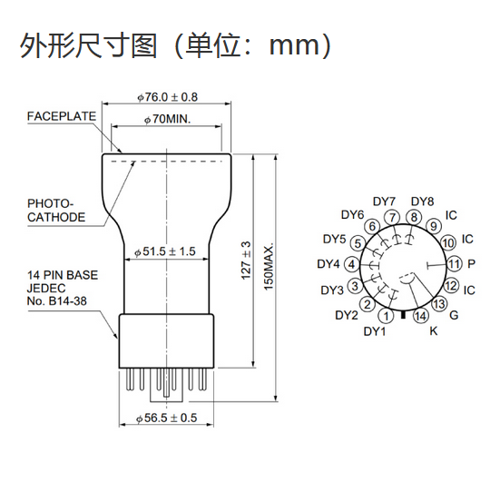 HAMAMATSU滨松 端窗型光电倍增管 R1307 详细参数 类型 端窗型 管子尺寸 76 mm 直径 光阴极面区域形状 圆形 光阴极面区域尺寸 70 mm 直径 波长(短) 300 nm 波长(长) 650 nm 波长(峰值) 420 nm 光谱灵敏度特性曲线代码 400K 光阴极面材料 双碱 窗材 硼硅玻璃 倍增器电极结构 盒式及网格 倍增器电极级数 8 [Max. Rating] 阳极至阴极电压 1500 V [Max. Rating] 平均阳极电流 0.1 mA 阳极至阴极电源电压 1000 V [Cathode] 亮度灵敏度最小值 80 μA/lm [Cathode] 亮度灵敏度典型值 110 μA/lm [Cathode] 蓝敏度指数 (CS 5-58) 典型值 12 [Cathode] 辐射灵敏度典型值 95 mA/W [Anode] 亮度灵敏度最小值 3 A/lm [Anode] 亮度灵敏度典型值 30 A/lm [Anode] 辐射灵敏度典型值 2.6 x 104 A/W [Anode] 增益率典型值 2.7 x 105 [Anode] 暗电流(30 分钟后) 典型值 2 nA [Anode] 暗电流(30 分钟后) 最大值 20 nA [Time Response] 上升时间典型值 8 ns [Time Response] 渡越时间典型值 64 ns 0755 84689265 ...