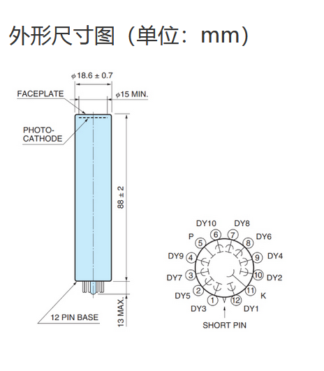 HAMAMATSU滨松 端窗型光电倍增管 R1617 详细参数 类型 端窗型 管子尺寸 19 mm 直径 光阴极面区域形状 圆形 光阴极面区域尺寸 15 mm 直径 波长(短) 300 nm 波长(长) 850 nm 波长(峰值) 420 nm 光谱灵敏度特性曲线代码 500K 光阴极面材料 多碱 窗材 硼硅玻璃 倍增器电极结构 线状聚光 倍增器电极级数 10 [Max. Rating] 阳极至阴极电压 1250 V [Max. Rating] 平均阳极电流 0.1 mA 阳极至阴极电源电压 1000 V [Cathode] 亮度灵敏度最小值 80 μA/lm [Cathode] 亮度灵敏度典型值 120 μA/lm [Cathode] 红白比 (R-68) 典型值 0.2 [Cathode] 辐射灵敏度典型值 51 mA/W [Anode] 亮度灵敏度最小值 30 A/lm [Anode] 亮度灵敏度典型值 120 A/lm [Anode] 辐射灵敏度典型值 5.1 x 104 A/W [Anode] 增益率典型值 1.0 x 106 [Anode] 暗电流(30 分钟后) 典型值 4 nA [Anode] 暗电流(30 分钟后) 最大值 20 nA [Time Response] 上升时间典型值 2.5 ns [Time Response] 渡越时间典型值 27 ns 0755 846892...