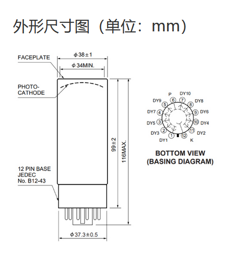 HAMAMATSU滨松 端窗型光电倍增管 R2066 详细参数 类型 端窗型 管子尺寸 38 mm 直径 光阴极面区域形状 圆形 光阴极面区域尺寸 34 mm 直径 波长(短) 300 nm 波长(长) 900 nm 波长(峰值) 600 nm 光谱灵敏度特性曲线代码 501K 光阴极面材料 扩展红多碱 窗材 硼硅玻璃 倍增器电极结构 圆形罩壳 倍增器电极级数 10 [Max. Rating] 阳极至阴极电压 1500 V [Max. Rating] 平均阳极电流 0.2 mA 阳极至阴极电源电压 1000 V [Cathode] 亮度灵敏度最小值 120 μA/lm [Cathode] 亮度灵敏度典型值 200 μA/lm [Cathode] 红白比 (R-68) 典型值 0.3 [Cathode] 辐射灵敏度典型值 40 mA/W [Anode] 亮度灵敏度最小值 20 A/lm [Anode] 亮度灵敏度典型值 50 A/lm [Anode] 辐射灵敏度典型值 1.0 x 104 A/W [Anode] 增益率典型值 2.5 x 105 [Anode] 暗电流(30 分钟后) 典型值 8 nA [Anode] 暗电流(30 分钟后) 最大值 30 nA [Time Response] 上升时间典型值 2.8 ns [Time Response] 渡越时间典型值 40 ns 0755 8468926...