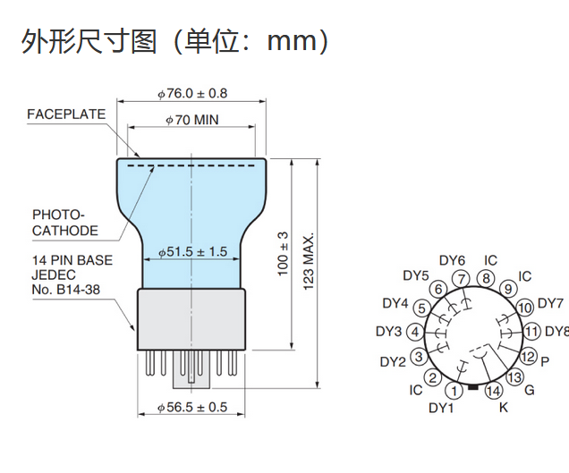 HAMAMATSU滨松 端窗型光电倍增管 R6233 详细参数 类型 端窗型 管子尺寸 76 mm 直径 光阴极面区域形状 圆形 光阴极面区域尺寸 70 mm 直径 波长(短) 300 nm 波长(长) 650 nm 波长(峰值) 420 nm 光谱灵敏度特性曲线代码 400K 光阴极面材料 双碱 窗材 硼硅玻璃 倍增器电极结构 盒式及网格+线状聚光 倍增器电极阶段 8 [Max. Rating] 阳极至阴极电压 1500 V [Max. Rating] 平均阳极电流 0.1 mA 阳极至阴极电源电压 1000 V [Cathode] 亮度灵敏度最小值 80 μA/lm [Cathode] 亮度灵敏度典型值 110 μA/lm [Cathode] 蓝敏度指数 (CS 5-58) 典型值 12 [Cathode] 辐射灵敏度典型值 95 mA/W [Anode] 亮度灵敏度最小值 3 A/lm [Anode] 亮度灵敏度典型值 30 A/lm [Anode] 辐射灵敏度典型值 2.6 x 104 A/W [Anode] 增益率典型值 2.7 x 105 [Anode] 暗电流(30 分钟后) 典型值 2 nA [Anode] 暗电流(30 分钟后) 最大值 20 nA [Time Response] 上升时间典型值 9.5 ns [Time Response] 渡越时间典型值 52 ns 07...
