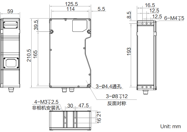 236 mm@远端Z轴分辨率 9.36 ~ 26.27 μm Z轴重复精度 2.20 μm@传感器在光学平台上测试标准量块的数据 Z轴线性度(±% of MR) 0.01 扫描帧率 3.4k Hz ~ 46.7k Hz(高帧率模式) 轮廓数据间隔 40.5 ~ 79.2 μm 数据输出类型 轮廓数据、深度图、亮度图 触发模式 软触发、硬触发(差分编码器触发) 激光波长 650 nm 激光安全等级 Class3R 电气特性 数据接口 Gigabit Ethernet(1000Mbit/s),兼容Fast Ethernet(100Mbit/s) 数字I/O 12-pin M12 接口提供供电和 I/O, 2路光耦隔离输入(Line 0/9),2路差分信号输入(Line 3/6),1 路差分信号输出(Line 1) 供电 24 VDC 典型功耗 17.2 W@24 VDC 结构 外形尺寸 210.5 mm × 125.5 mm × 59 mm 重量 约1550 g IP防护等级 IP67 温度 工作温度0 ~ 45°C,储藏温度-30 ~ 80°C 湿度 20%~85%RH无凝结 一般规范 软件 3DMVS、VM3D及其它第三方3D软件 操作系统 Windows 7/10 32/64bits、Windows 11 64bits(推荐:i5处理器、8G内存及以上)