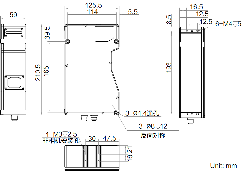 482 mm@远端Z轴分辨率 14.45 ~ 98.78 μm Z轴重复精度 4.84 μm@传感器在光学平台上测试标准量块的数据 轮廓数据间隔 50.3 ~ 159.4 μm Z轴线性度(±% of MR) 0.01 数据输出类型 轮廓数据、深度图、亮度图 扫描帧率 3.4k Hz ~ 46.7k Hz(高帧率模式) 激光安全等级 Class3B 激光波长 405 nm 触发模式 软触发、硬触发(差分编码器触发) 电气特性 数据接口 Gigabit Ethernet(1000Mbit/s),兼容Fast Ethernet(100Mbit/s) 数字I/O 12-pin M12 接口提供供电和 I/O, 2路光耦隔离输入(Line 0/9),2路差分信号输入(Line 3/ 6),1 路差分信号输出(Line 1) 供电 24 VDC 典型功耗 17.2 W@24 VDC 结构 外形尺寸 210.5 mm × 125.5 mm × 59 mm 重量 约1550 g IP防护等级 IP67 温度 工作温度0 ~ 45°C,储藏温度-30 ~ 80°C 湿度 20%~85%RH无凝结 一般规范 软件 3DMVS、VM3D及其它第三方3D软件 操作系统 Windows 7/10 32/64bits、Windows 11 64bits(8G内存,i5处理器)