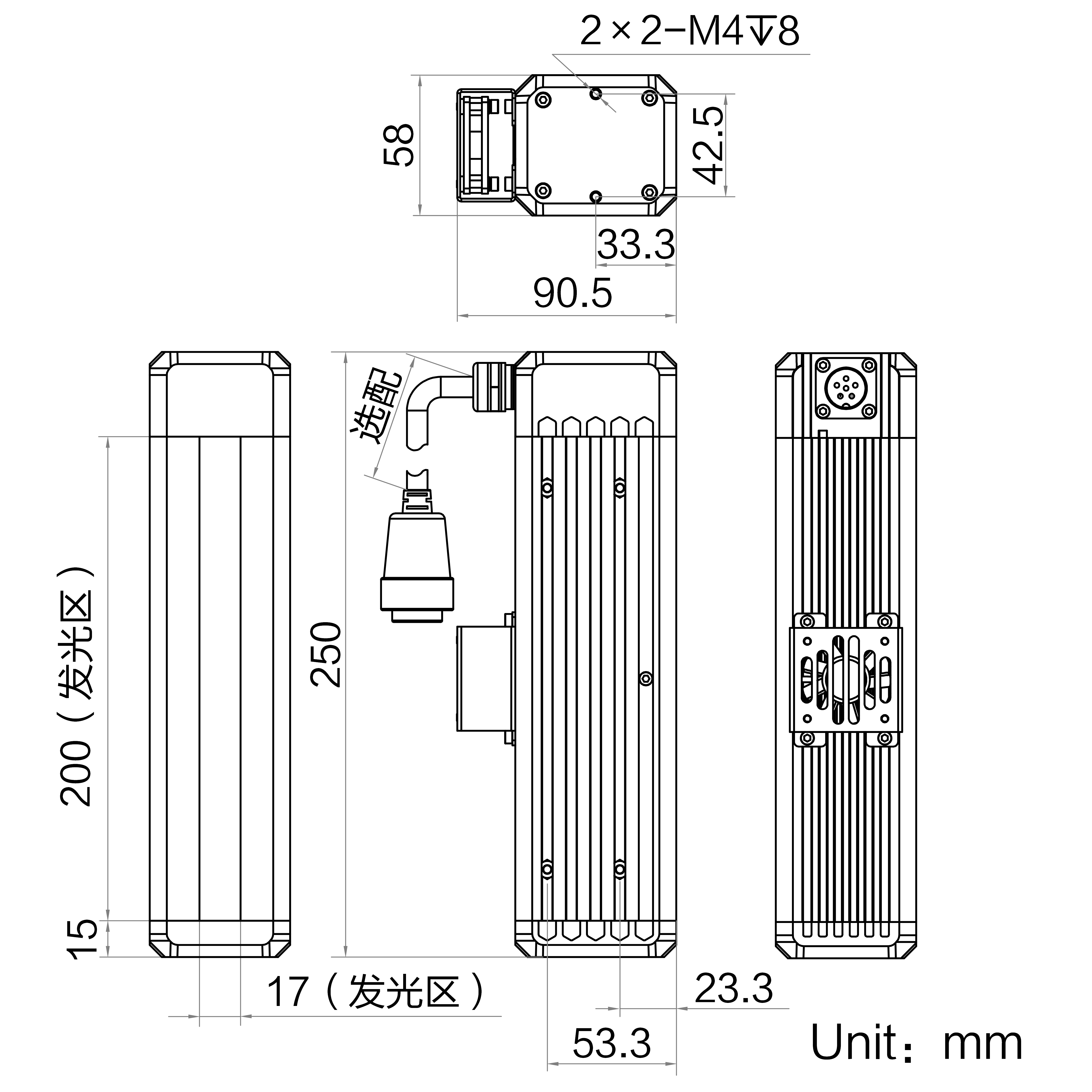 型号 型号 MV-LTDS-H-200-W 名称 MV-LTDS-H-200-W 性能 颜色 白色 最佳工作距离 10 ~ 200 mm 色温 6000 ~ 7000K 中心照度 ≥100W Lux@WD=50 mm 电气特性 功率 84 W 接口类型 19M-8H 结构 外形尺寸 250 mm × 58 mm × 90.5 mm 发光区尺寸 200 mm × 17 mm 灯珠排数 1 重量 1.6 kg 供电线长度 额外选配 温度 工作温度0~40°C,储藏温度-20~60°C 湿度 20~90%RH无冷凝