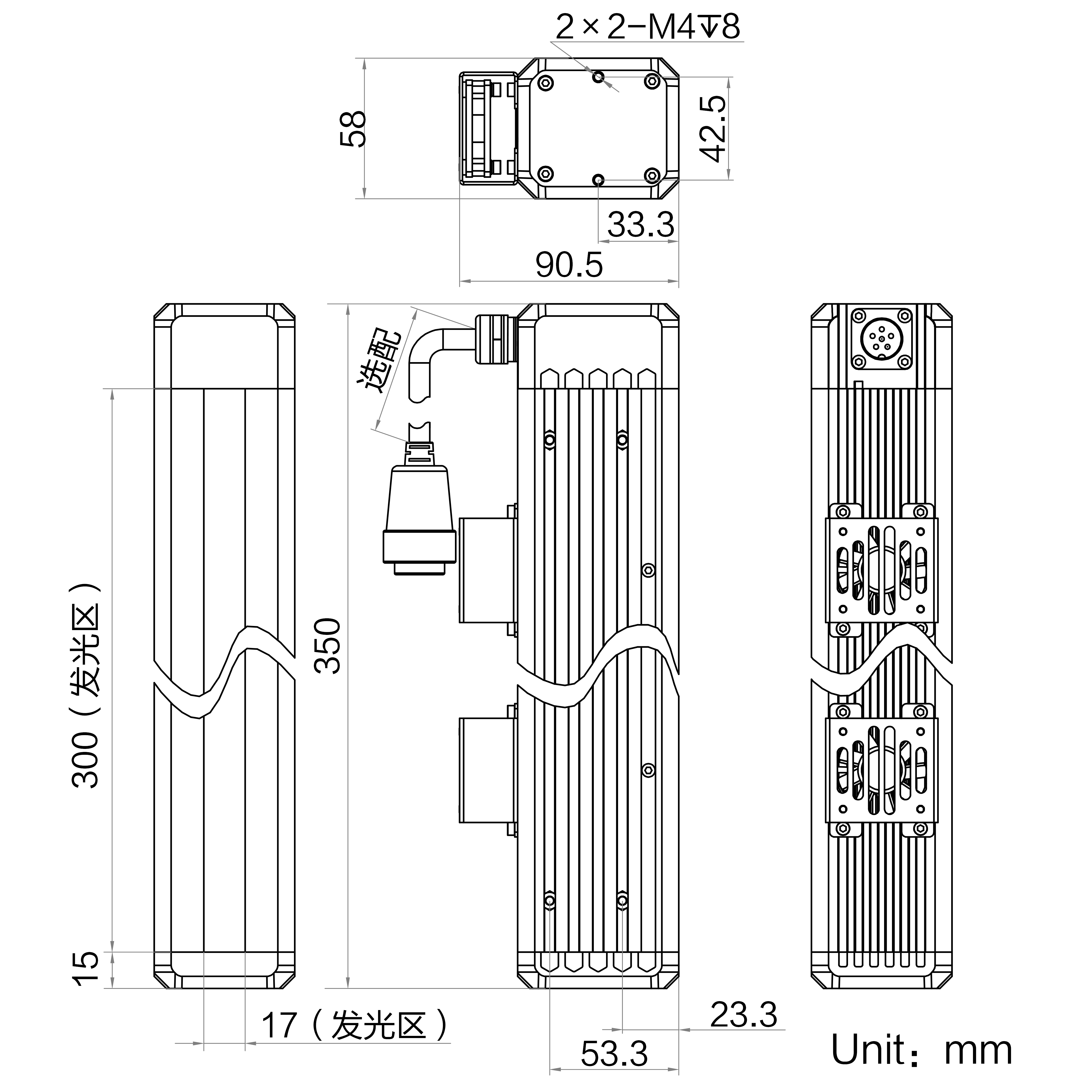 型号 型号 MV-LTDS-H-300-W 名称 MV-LTDS-H-300-W 性能 颜色 白色 最佳工作距离 10 ~ 200 mm 色温 6000 ~ 7000K 中心照度 ≥100W Lux@WD=50 mm 电气特性 功率 126 W 接口类型 19M-8H 结构 外形尺寸 350 mm × 58 mm × 90.5 mm 发光区尺寸 300 mm × 17 mm 灯珠排数 1 重量 2.11 kg 供电线长度 额外选配 温度 工作温度0~40°C,储藏温度-20~60°C 湿度 20~90%RH无冷凝
