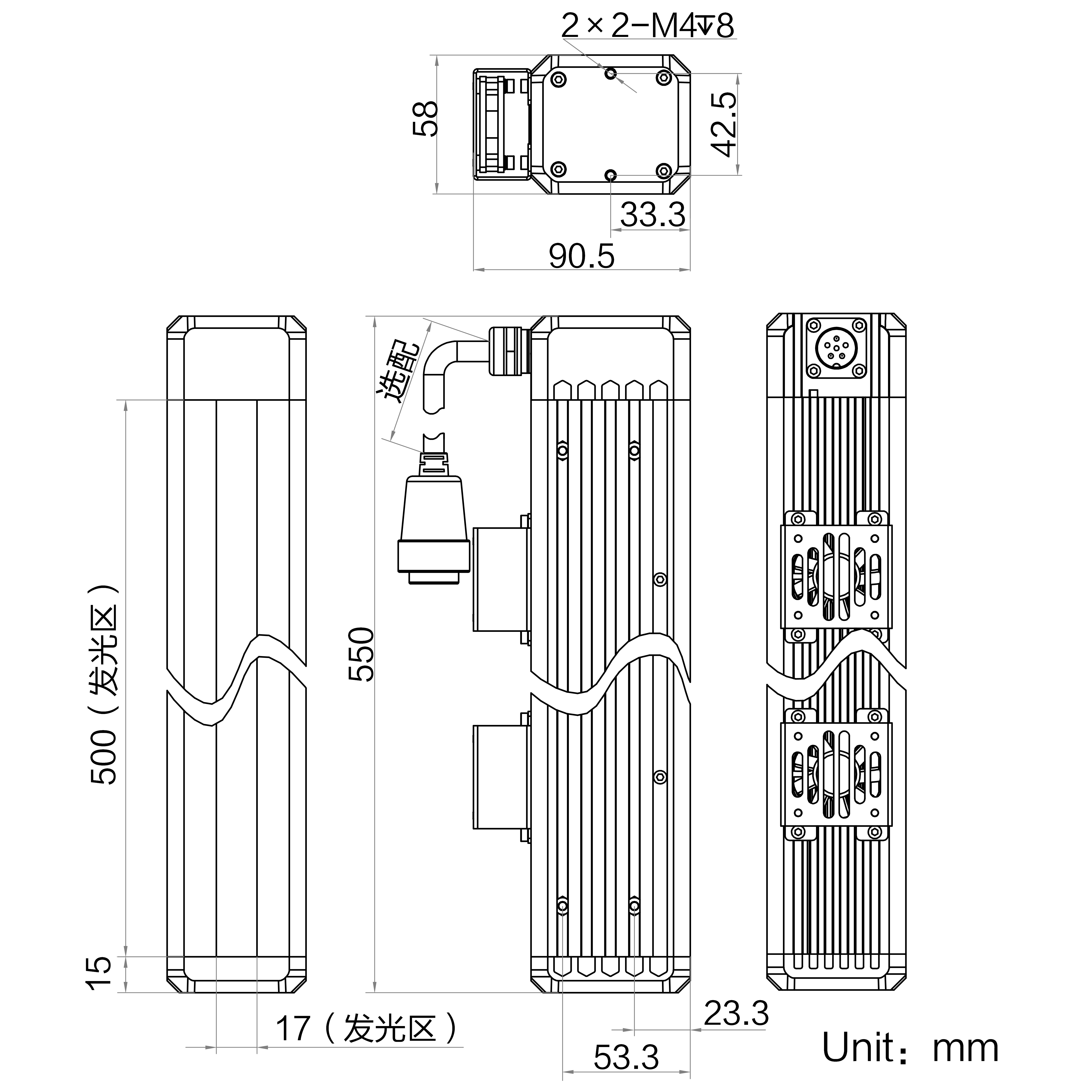型号 型号 MV-LTDS-H-500-W 名称 MV-LTDS-H-500-W 性能 颜色 白色 最佳工作距离 10 ~ 200 mm 色温 6000 ~ 7000K 中心照度 ≥100W Lux@WD=50 mm 电气特性 功率 210 W 接口类型 19M-8H 结构 外形尺寸 550 mm × 58 mm × 90.5 mm 发光区尺寸 500 mm × 17 mm 灯珠排数 1 重量 3.14 kg 供电线长度 额外选配 温度 工作温度0~40°C,储藏温度-20~60°C 湿度 20~90%RH无冷凝