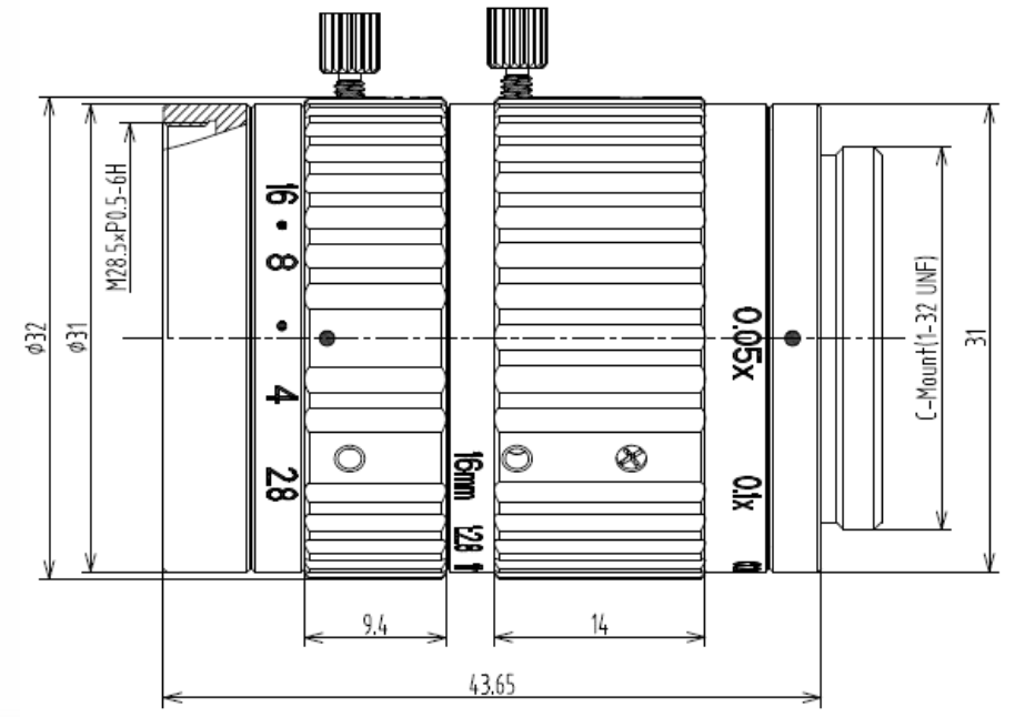 | 名称 | 16mm,F2.8,1.1",C接口,微距镜头(52mm(-0.25X)-546mm(-0.03X)) | |